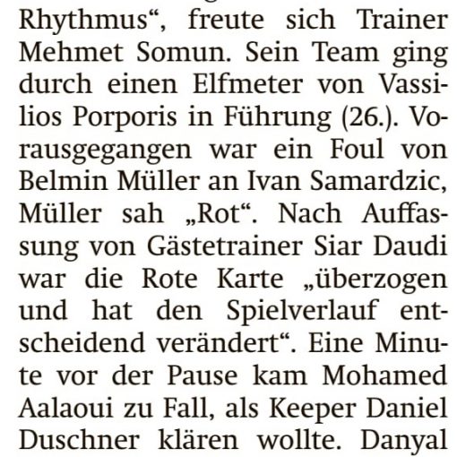 Türkgücü Frankfurt – FFV Sportfreunde 2:2 (0:2). – Beinahe wäre den „Speuzern“ im Nachbarschaftsduell sogar der erste Saisonsieg gelungen, denn Naveed Zafar (31.) und Millon Mehari (37.) schossen die Führung zur Halbzeit heraus. Erst nach dem Seitenwechsel konnte Türkgücü auf dem heimischen Rasenplatz die drohende Blamage abwenden. Kapitän Emre Kadimli (67.) und Mete Nakipoglu (88.) verhinderten die Heimniederlage gegen gut verteidigende Gäste, bei denen in der Nachspielzeit Uyiosa Osazuwa Edegbe noch die Gelb-Rote Karte sah (90.+6). Türkgücü-Trainer Hakan Tekin ärgerte sich über die „mit Abstand schlechteste erste Halbzeit. Da war kein Zugriff, keine Idee, kein Wille und kein Ehrgeiz. Erst nach personellen und taktischen Umstellungen konnten wir zumindest die Ehre wiederherstellen.“ Sportfreunde-Trainer Lamine Kaiser bedauerte: „Wir haben das 3:0 verpasst, am Ende hat Türkgücü massiv Druck aufgebaut.“